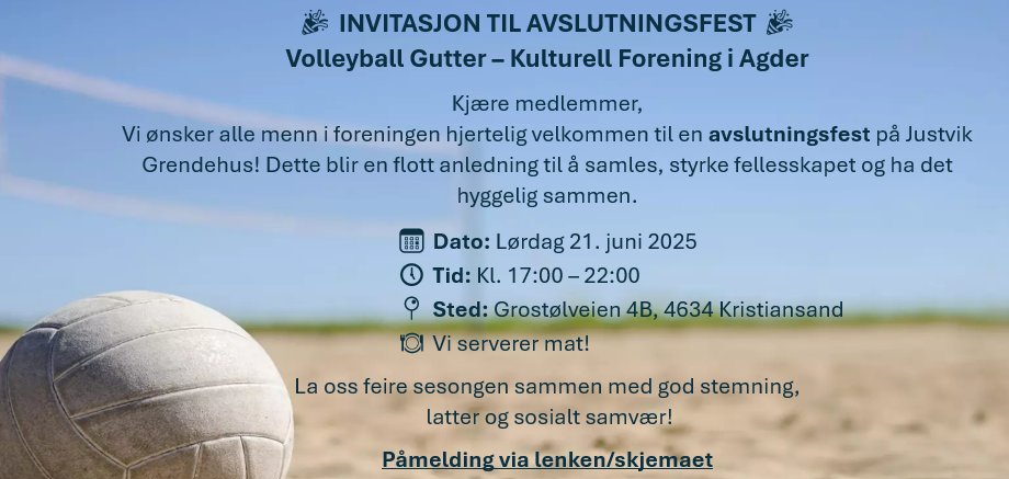 Vi ønsker alle menn i foreningen hjertelig velkommen til en avslutningsfest på Justvik Grendehus! Dette blir en flott anledning til å samles, styrke fellesskapet og ha det hyggelig sammen.